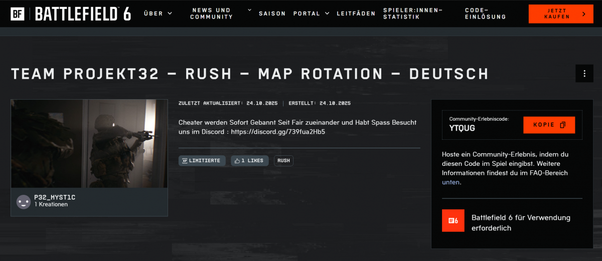 eSport News Team Projekt32 – Rush – Map Rotation – Deutsch Oktober 25, 2025 https://www.ea.com/de/games/battlefield/battlefield-6/portal/buy/creation/9aba00b0-b0ac-11f0-b9e9-5d183d087182
